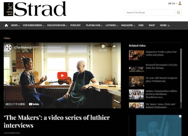 登上The Strad 杂志首页 BDA相关文章, DS相关文章, LC相关文章, PP相关, UH相关文章, 制琴者 2022, 消息Gino Yu2022年11月5日评论自此,Strad杂志网站上有了“Yu Jie” 和 “The Makers” 词条