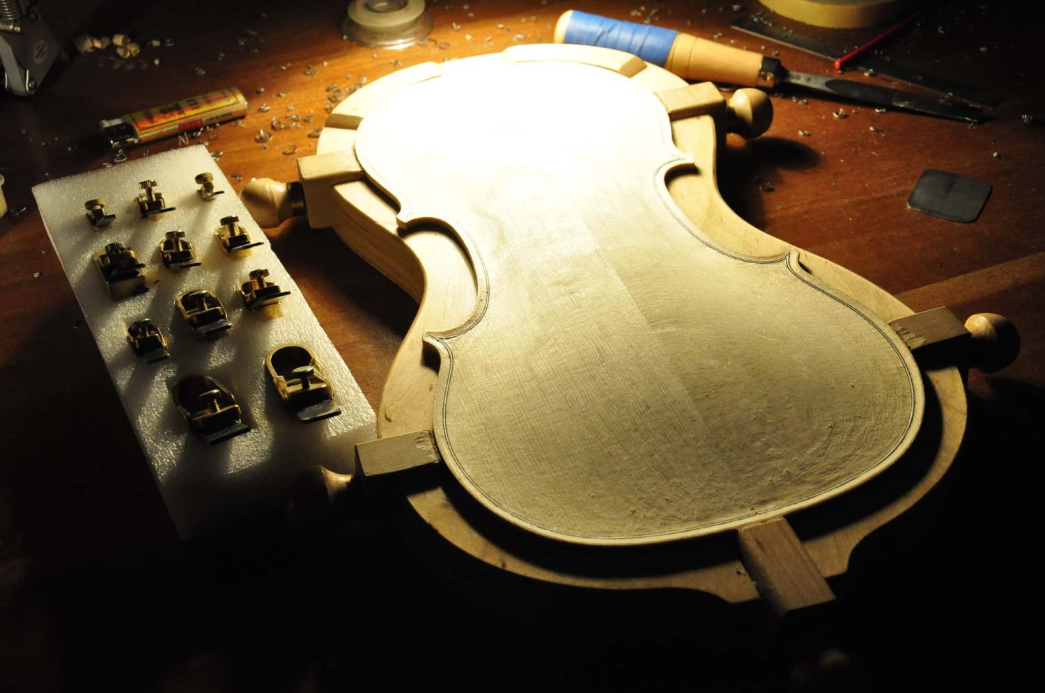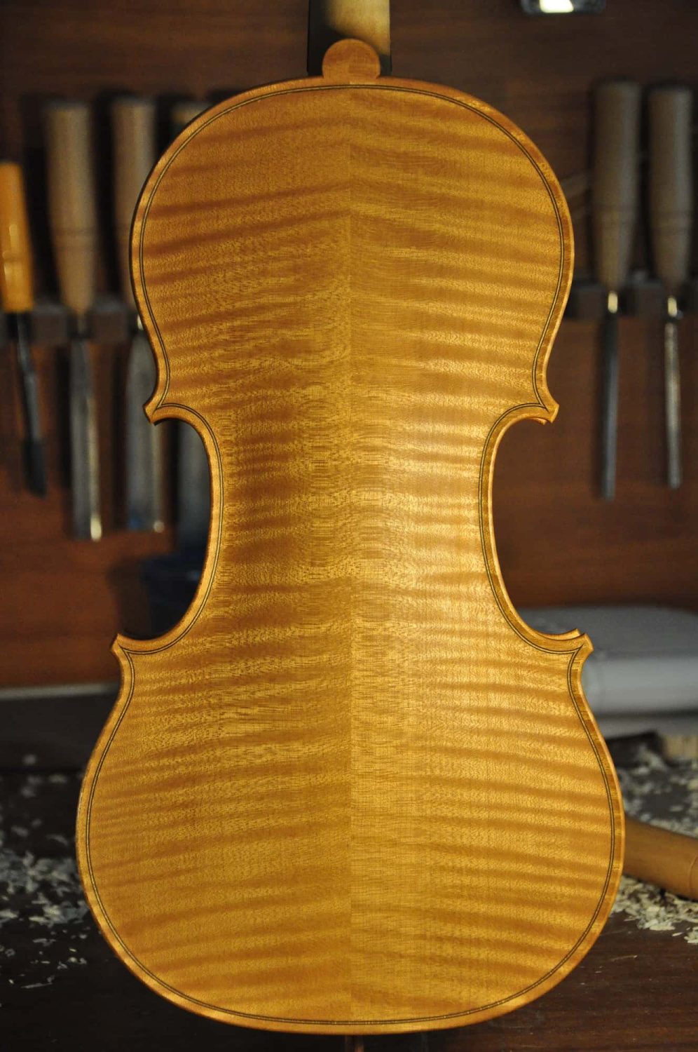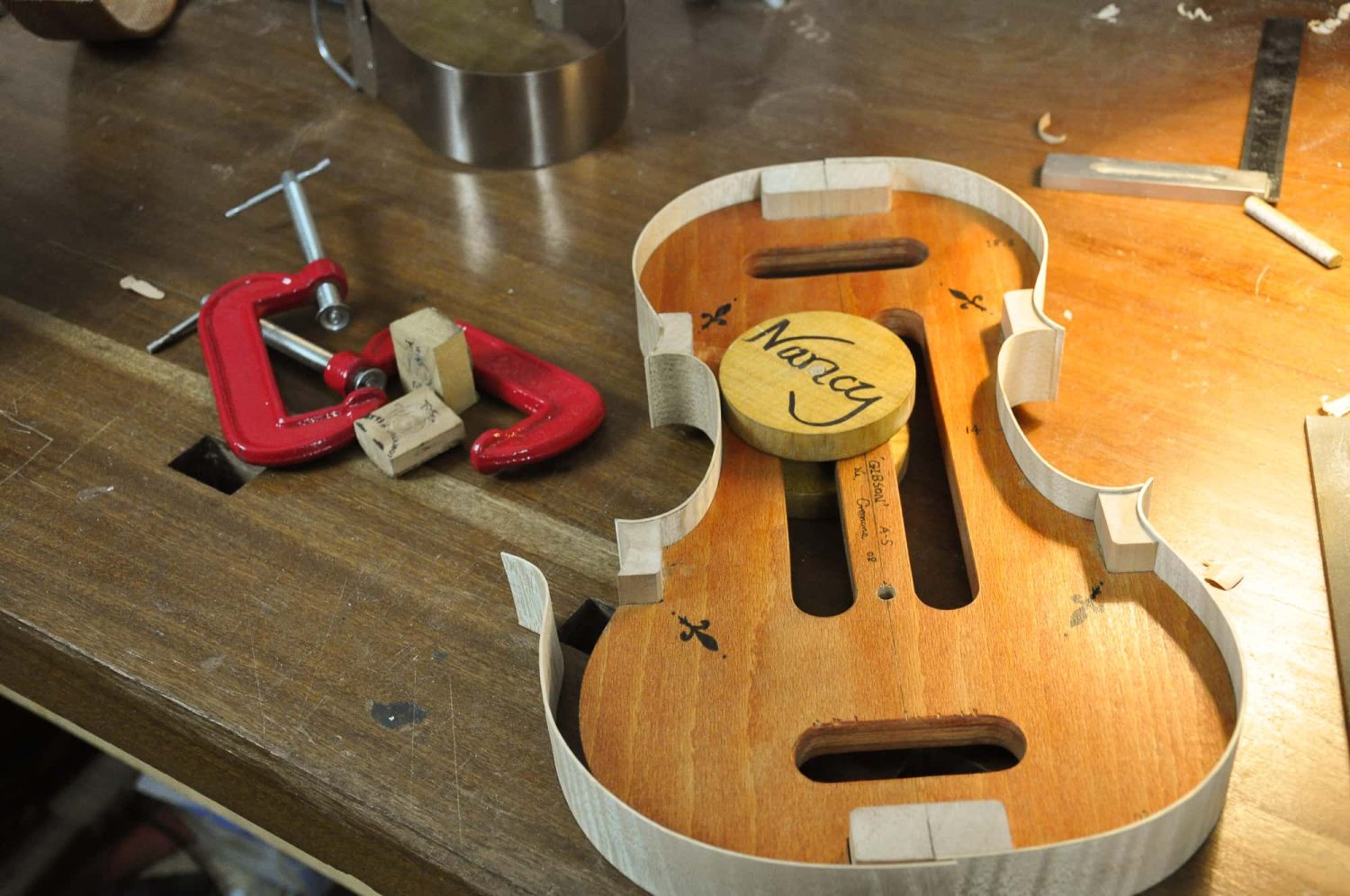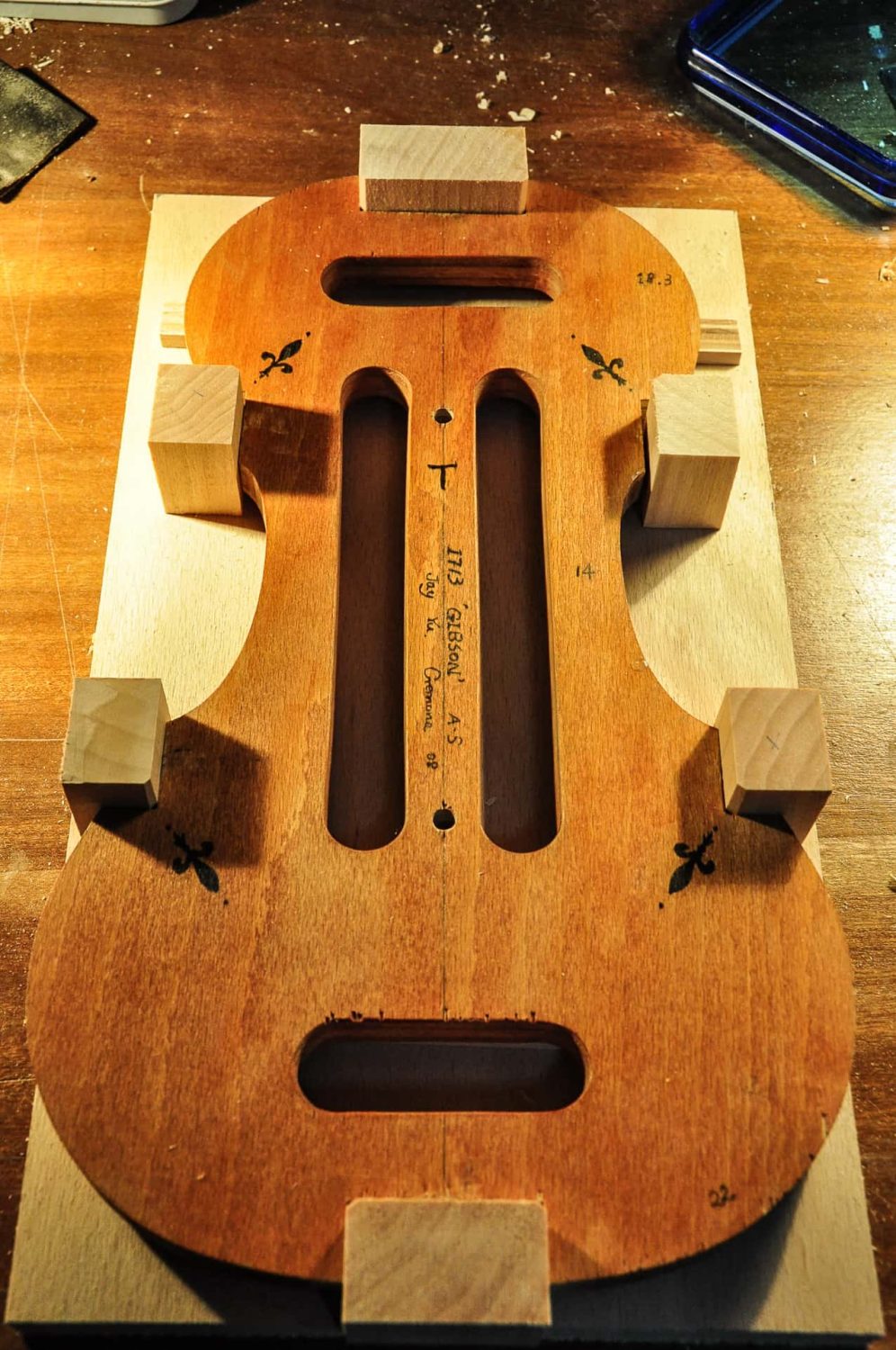 模具:这个斯式的1713Gibson模具是我最早使用的几个模具之一,设计制作于2008年意大利Cremona。当时的审美与现在截然不投,我更偏向于轻柔,华丽的美。这个模具我使用制作的提琴应该不到5只。