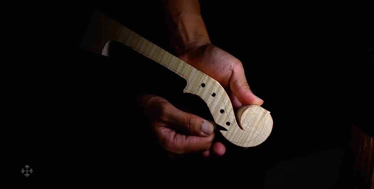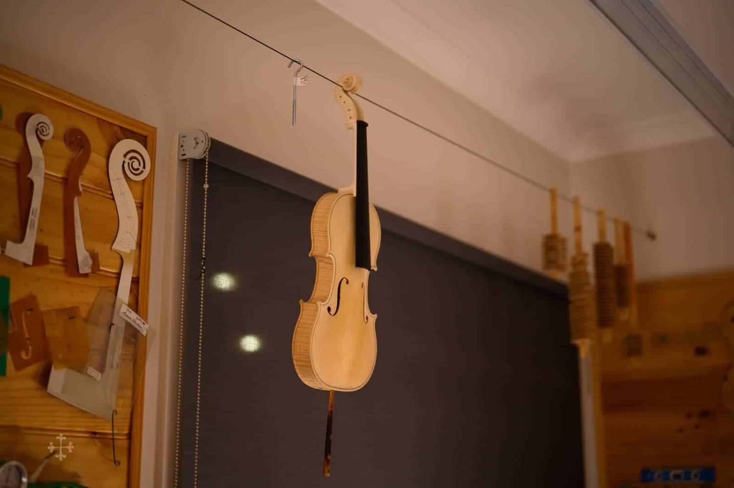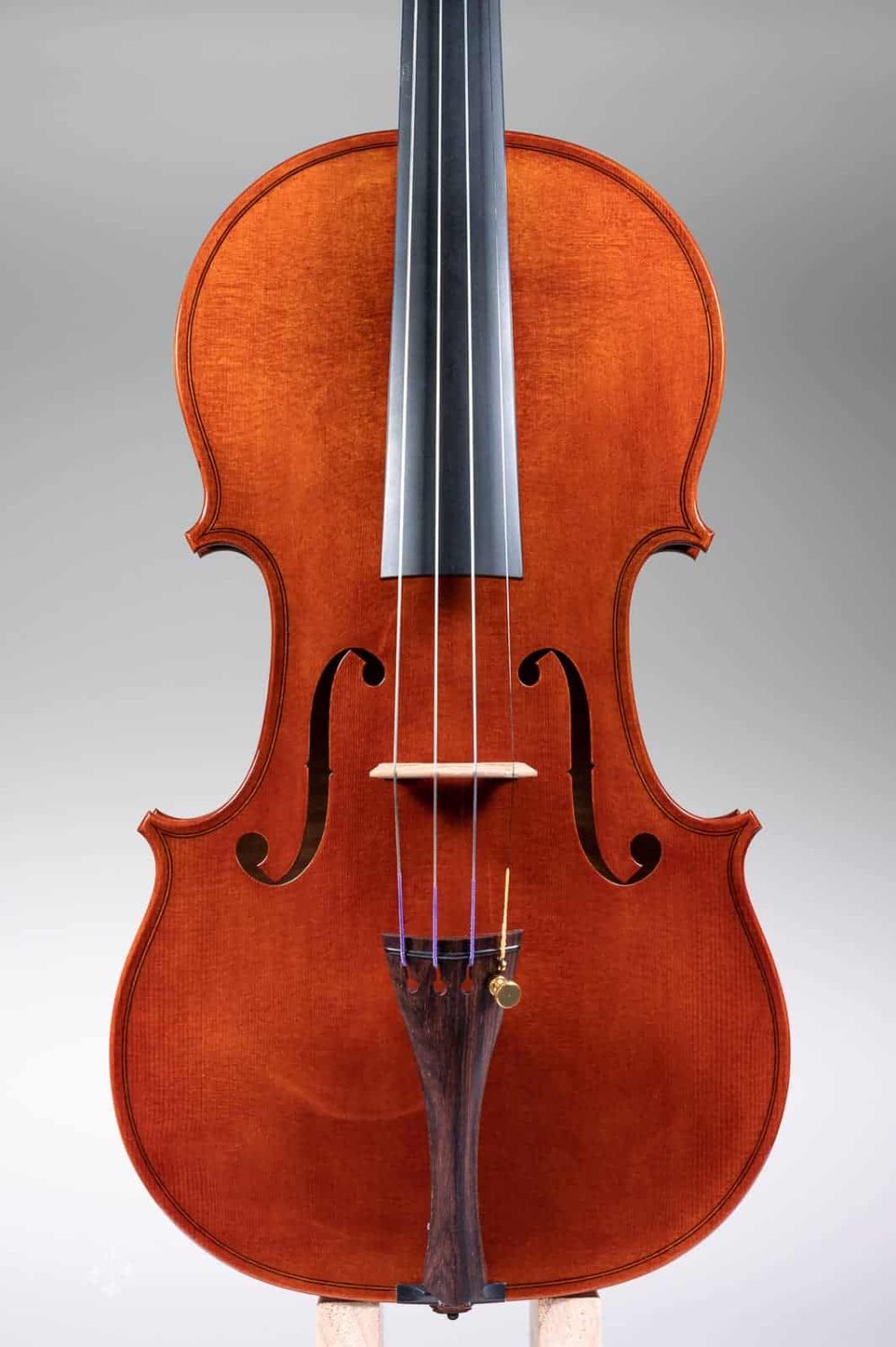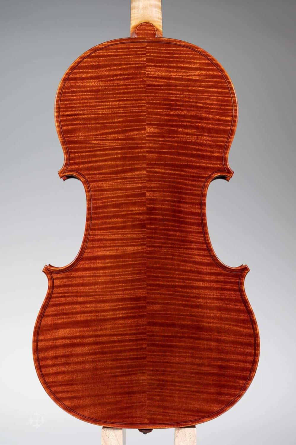 该作品由北京王小姐定制于2017年。作品编号:JY43,昵称“Biberach”。该作品的琴型设计以及细节比例,大多来自于2022年游学德国Ulrich Hinsberger工作室时所绘制。该工作室位于Biberach小镇,故以此为乐器命名。琴型为个人化的A.stradivari P 模具,木材选择为Bosnia枫木加上Bachmann云杉面板。