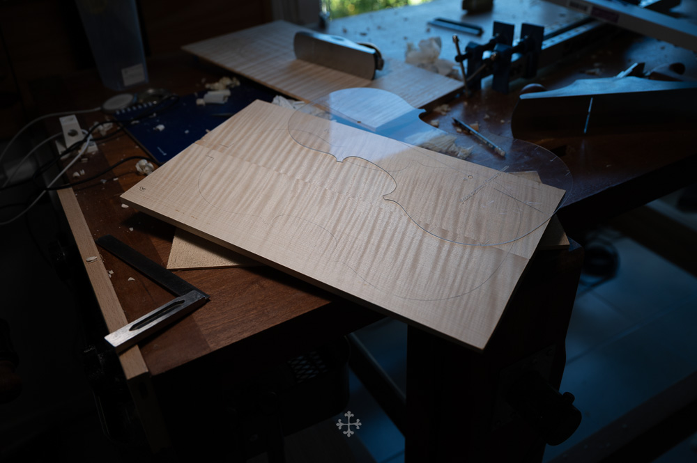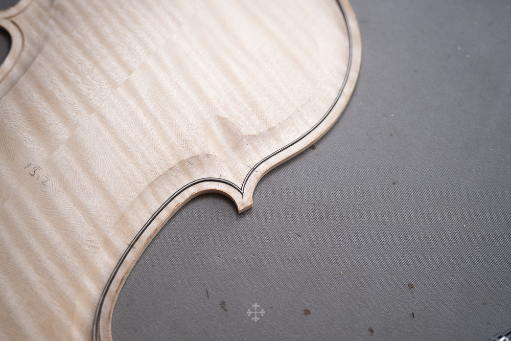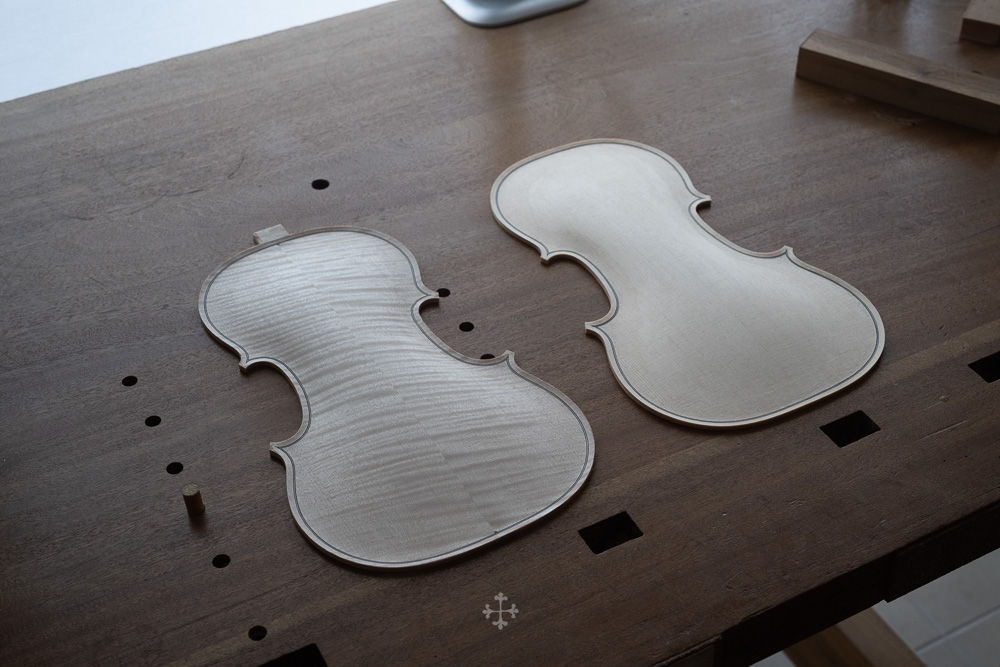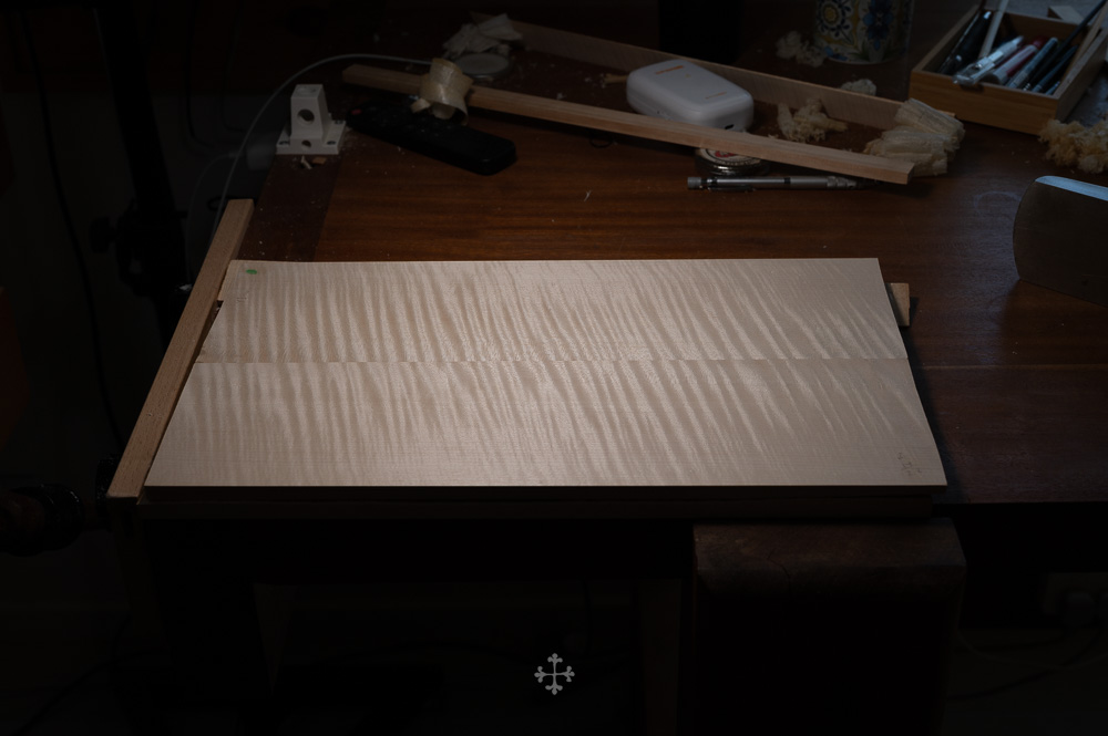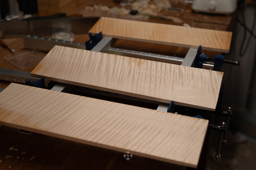 这块枫木由我的师父郑荃于去年夏天赠予,木材干燥于2006年,至今已近二十年。时间在其中缓慢沉淀,使其结构愈发稳定,声学特性也更趋成熟。基于整体构思,我选择了同方向对称拼接的方式,使纹理在视觉与结构上保持统一与延续;而在最终的中缝处理上,则采用了法国制琴师 Viateur Roy 去年(2025)所传授的一种新的拼缝方法。