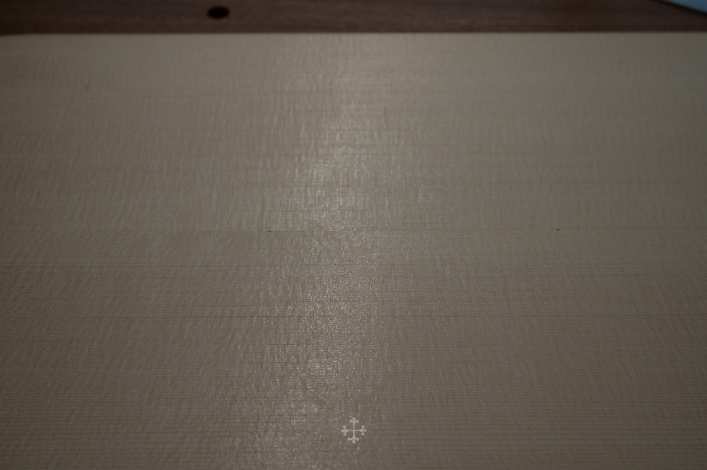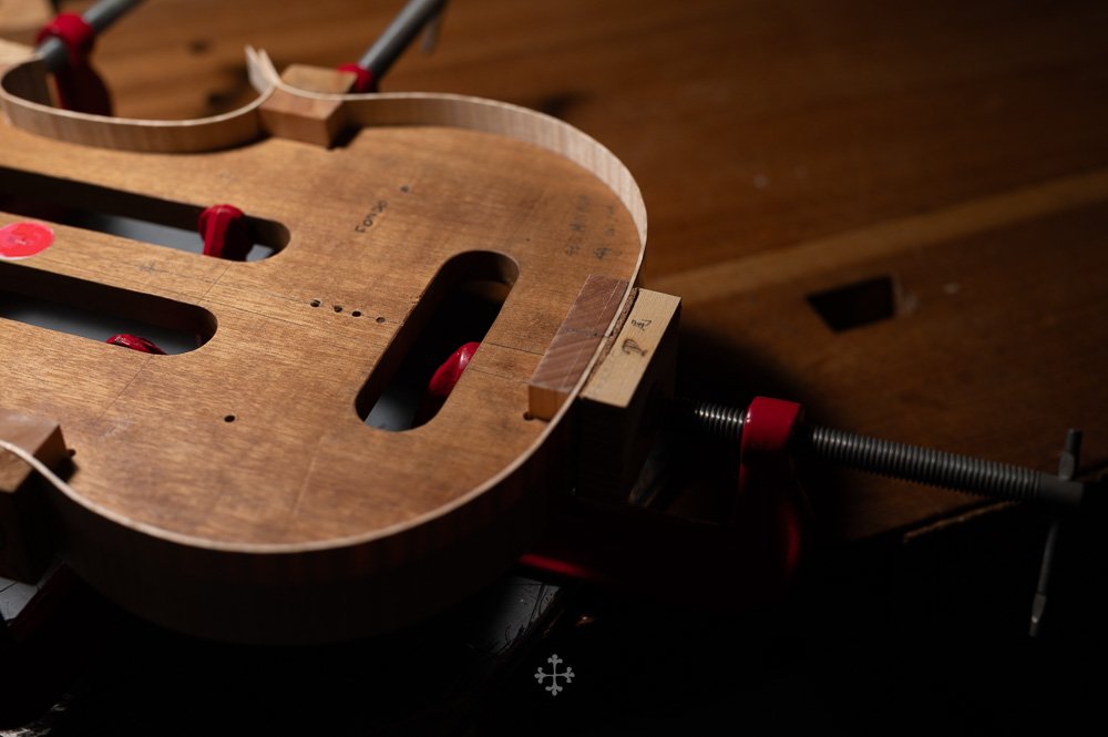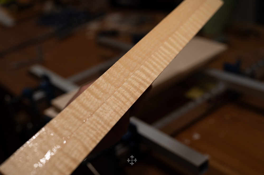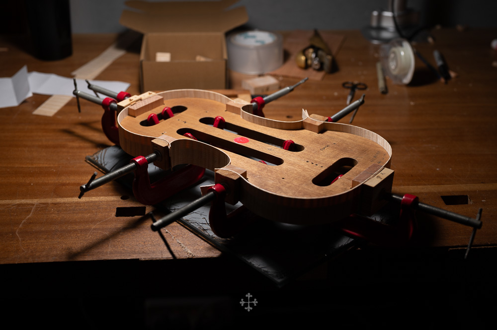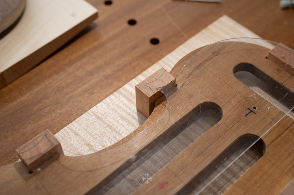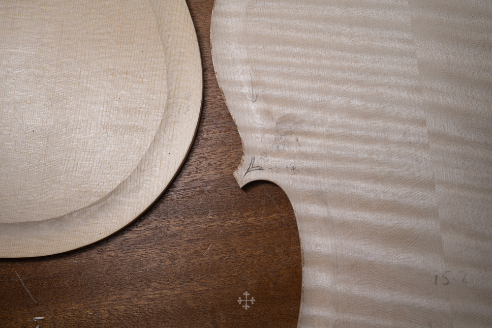 这块枫木由我的师父郑荃于去年夏天赠予,木材干燥于2006年,至今已近二十年。时间在其中缓慢沉淀,使其结构愈发稳定,声学特性也更趋成熟。基于整体构思,我选择了同方向对称拼接的方式,使纹理在视觉与结构上保持统一与延续;而在最终的中缝处理上,则采用了法国制琴师 Viateur Roy 去年(2025)所传授的一种新的拼缝方法。