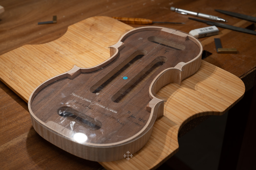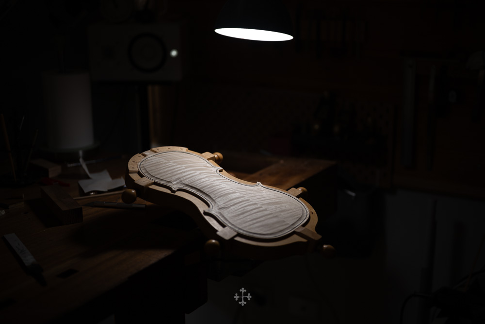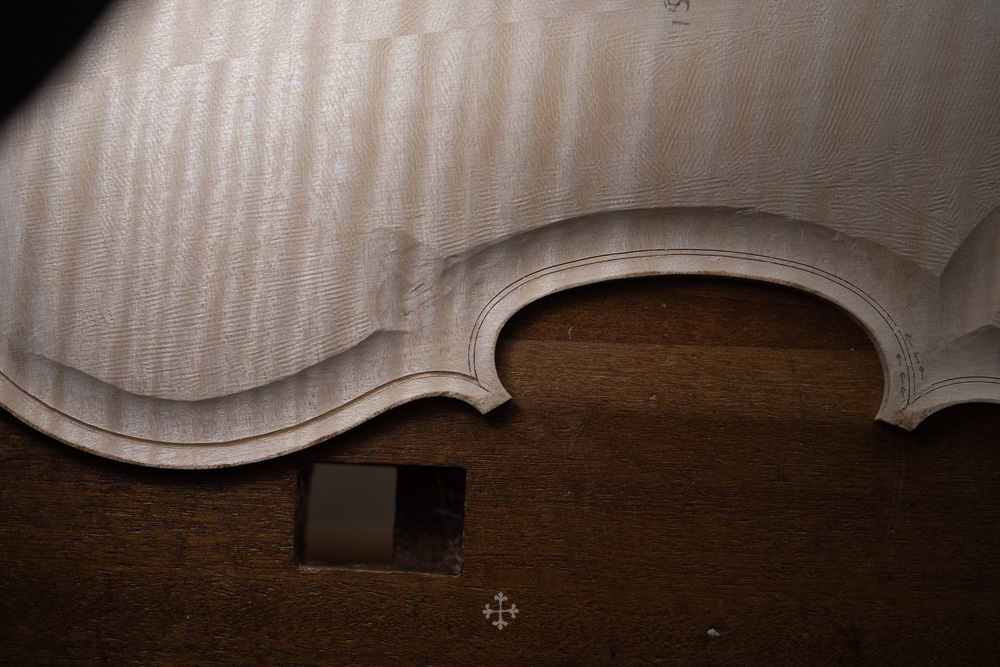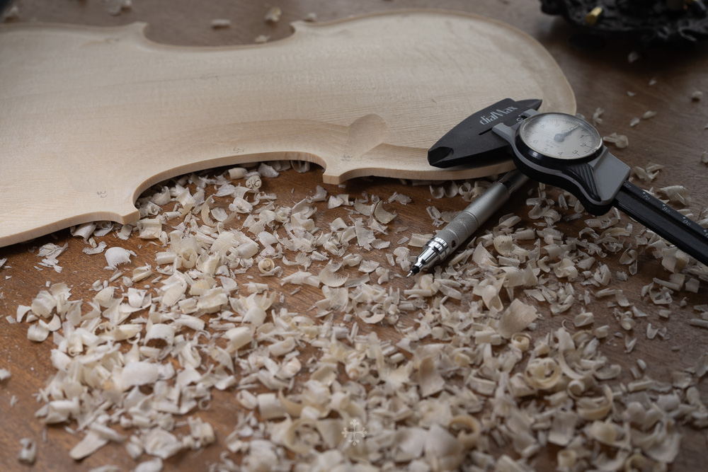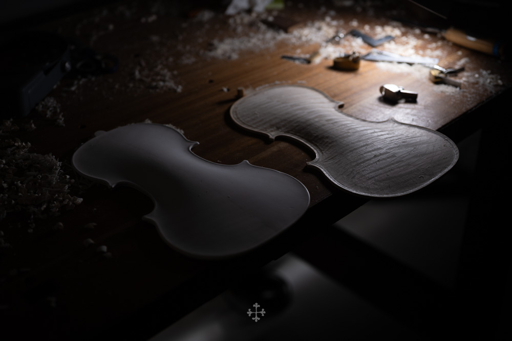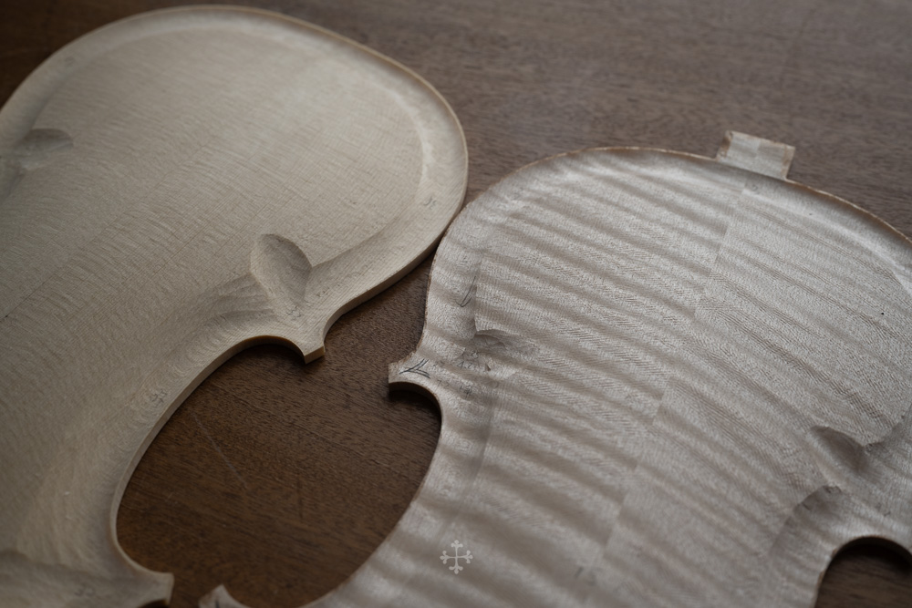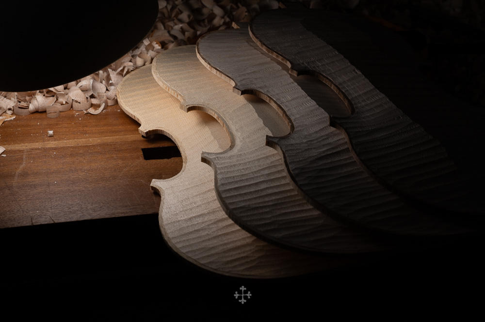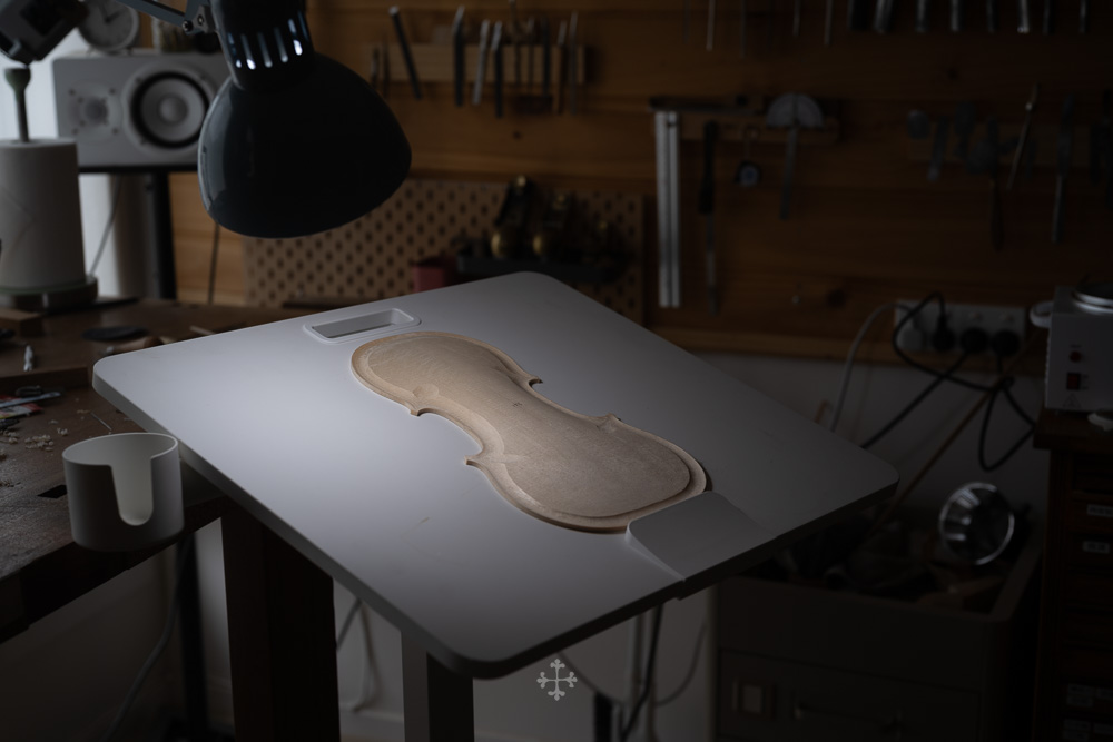 在弧度的加工过程中,我更多参考了在德国接触到的一件斯特拉迪瓦里乐器的背板石膏道模。我并未尝试复刻它的结果,而是借助这一接近原作的媒介,去揣测当年 Antonio Stradivari 在制作时的思维路径——哪些位置在他眼中是线性的延展,哪些地方则转入弧线的流动。这种理解,并不来自测量本身,而来自于对“如何看待形体”的重新学习。