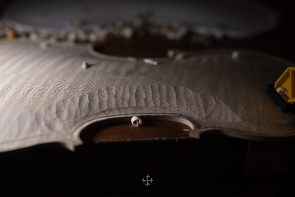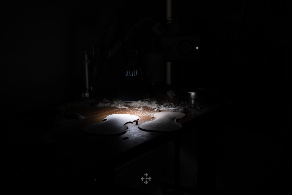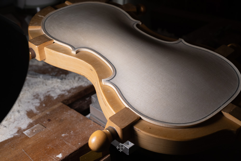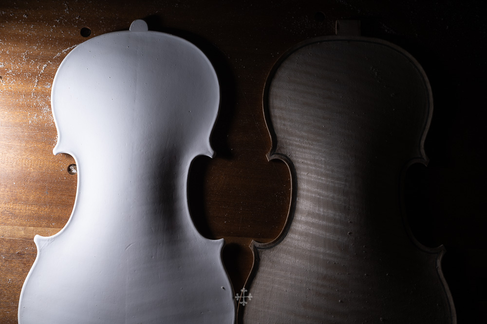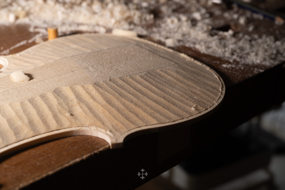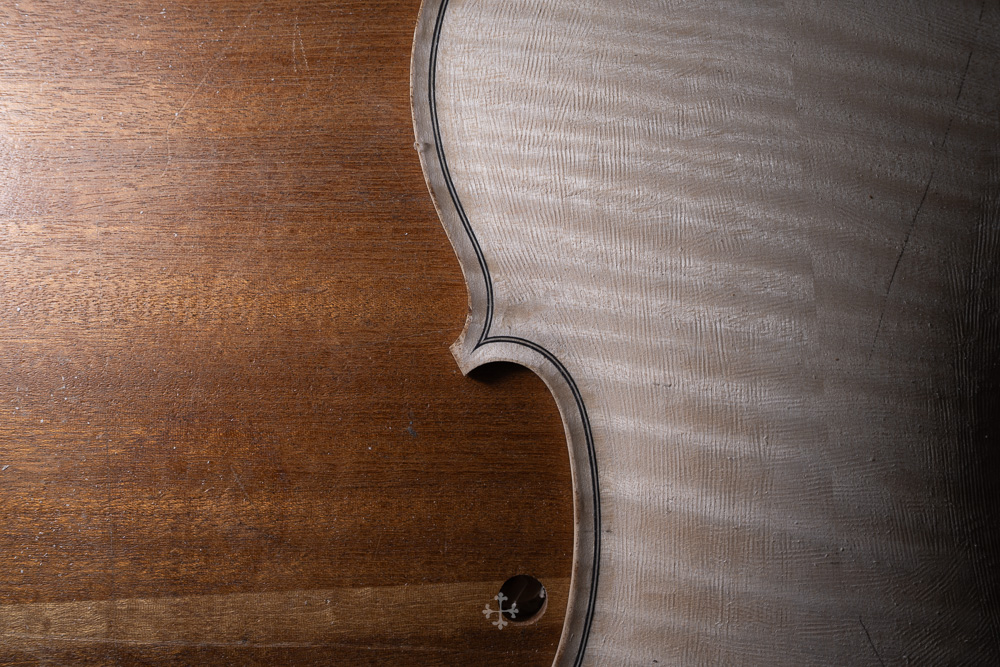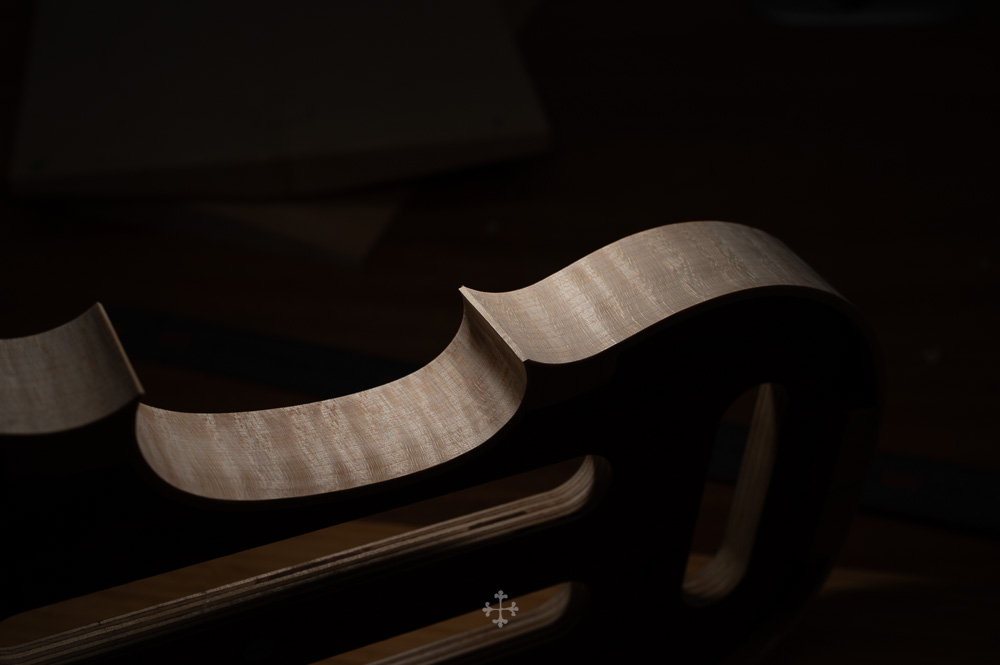 在弧度的加工过程中,我更多参考了在德国接触到的一件斯特拉迪瓦里乐器的背板石膏道模。我并未尝试复刻它的结果,而是借助这一接近原作的媒介,去揣测当年 Antonio Stradivari 在制作时的思维路径——哪些位置在他眼中是线性的延展,哪些地方则转入弧线的流动。这种理解,并不来自测量本身,而来自于对“如何看待形体”的重新学习。