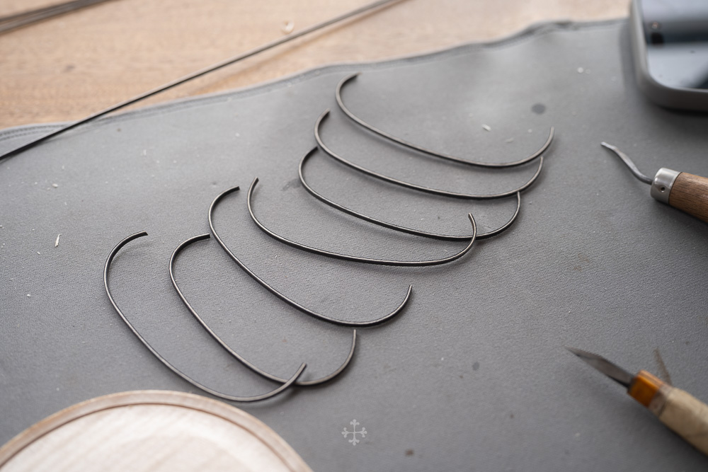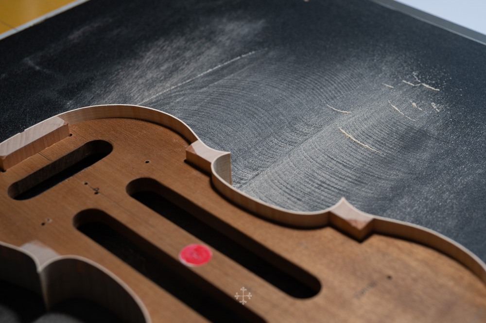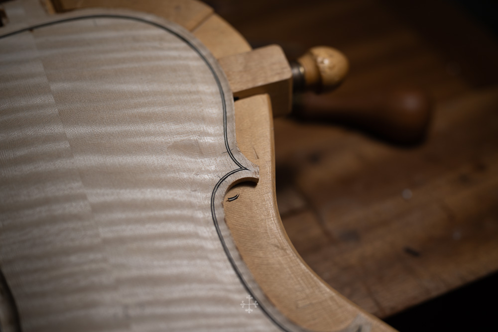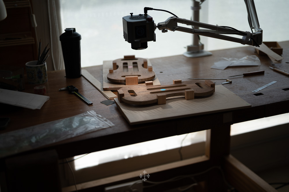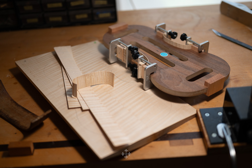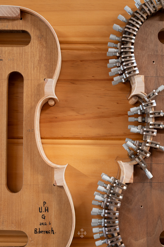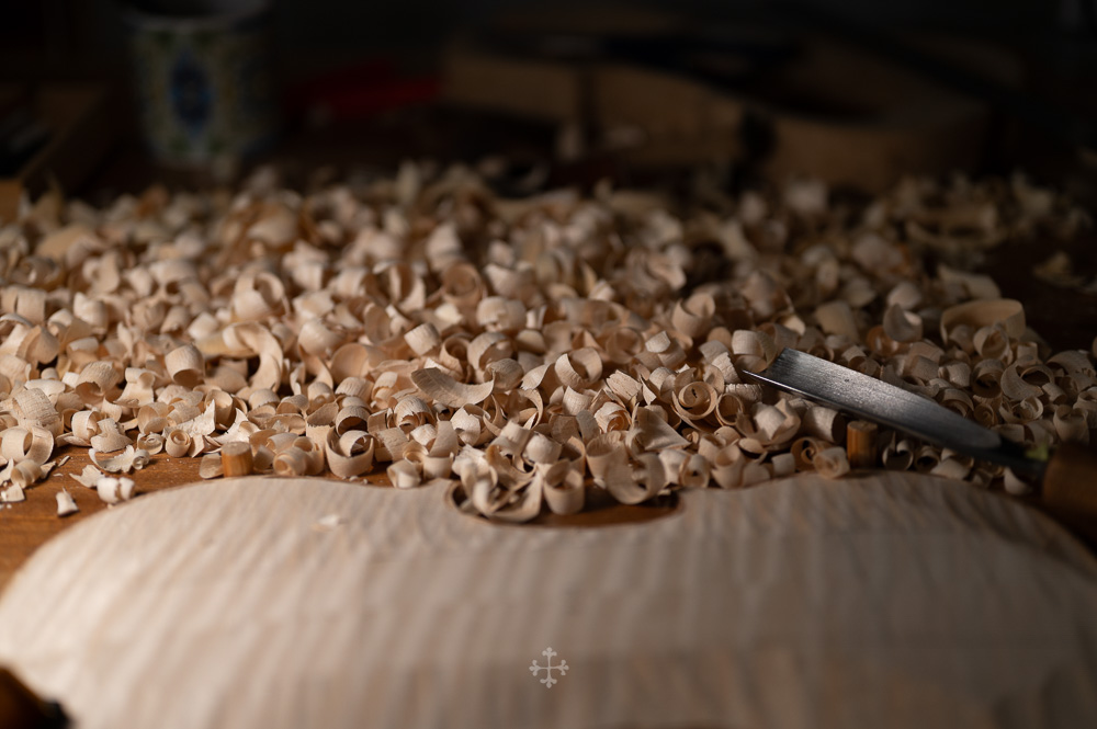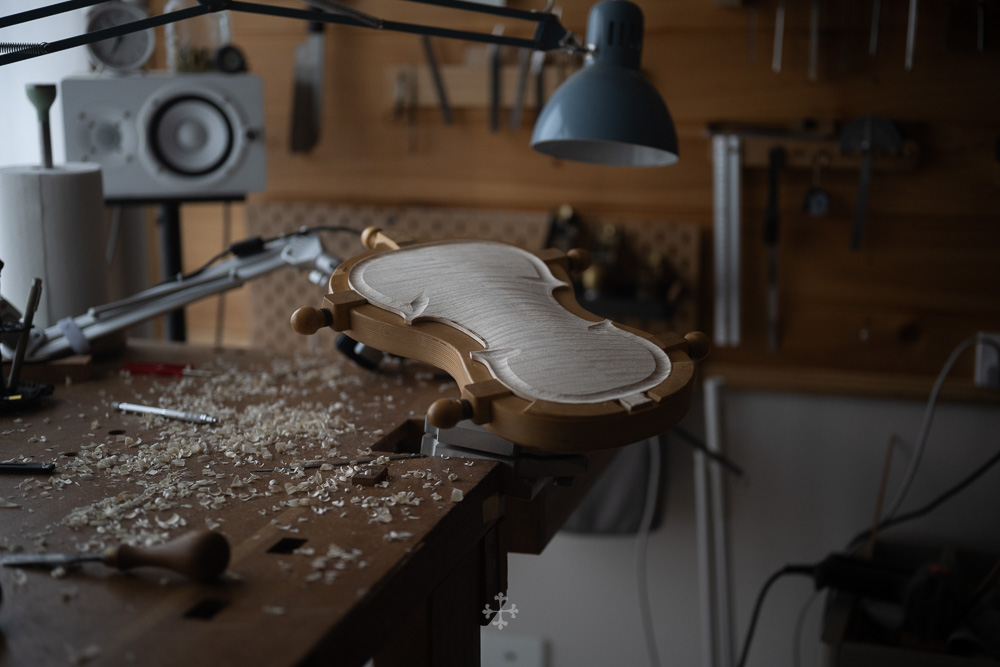 在弧度的加工过程中,我更多参考了在德国接触到的一件斯特拉迪瓦里乐器的背板石膏道模。我并未尝试复刻它的结果,而是借助这一接近原作的媒介,去揣测当年 Antonio Stradivari 在制作时的思维路径——哪些位置在他眼中是线性的延展,哪些地方则转入弧线的流动。这种理解,并不来自测量本身,而来自于对“如何看待形体”的重新学习。